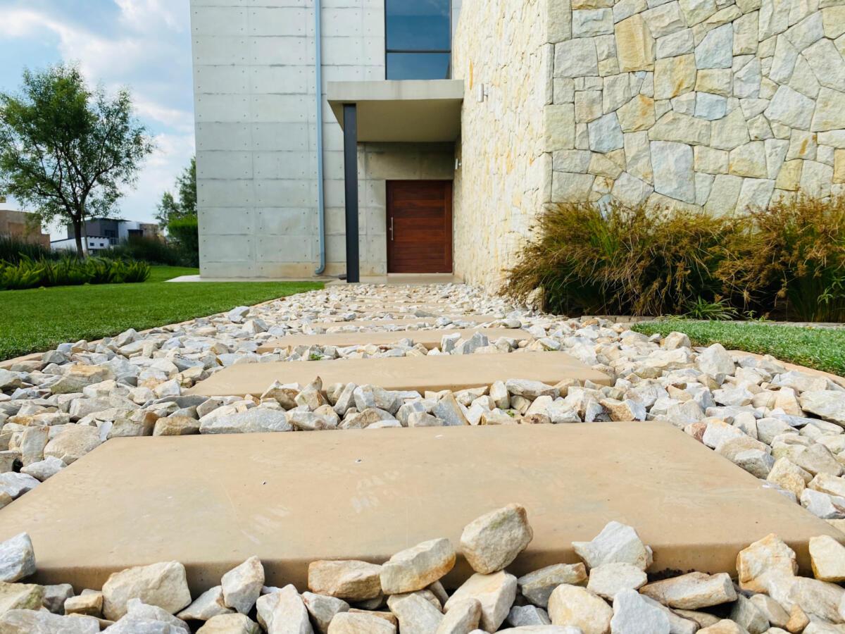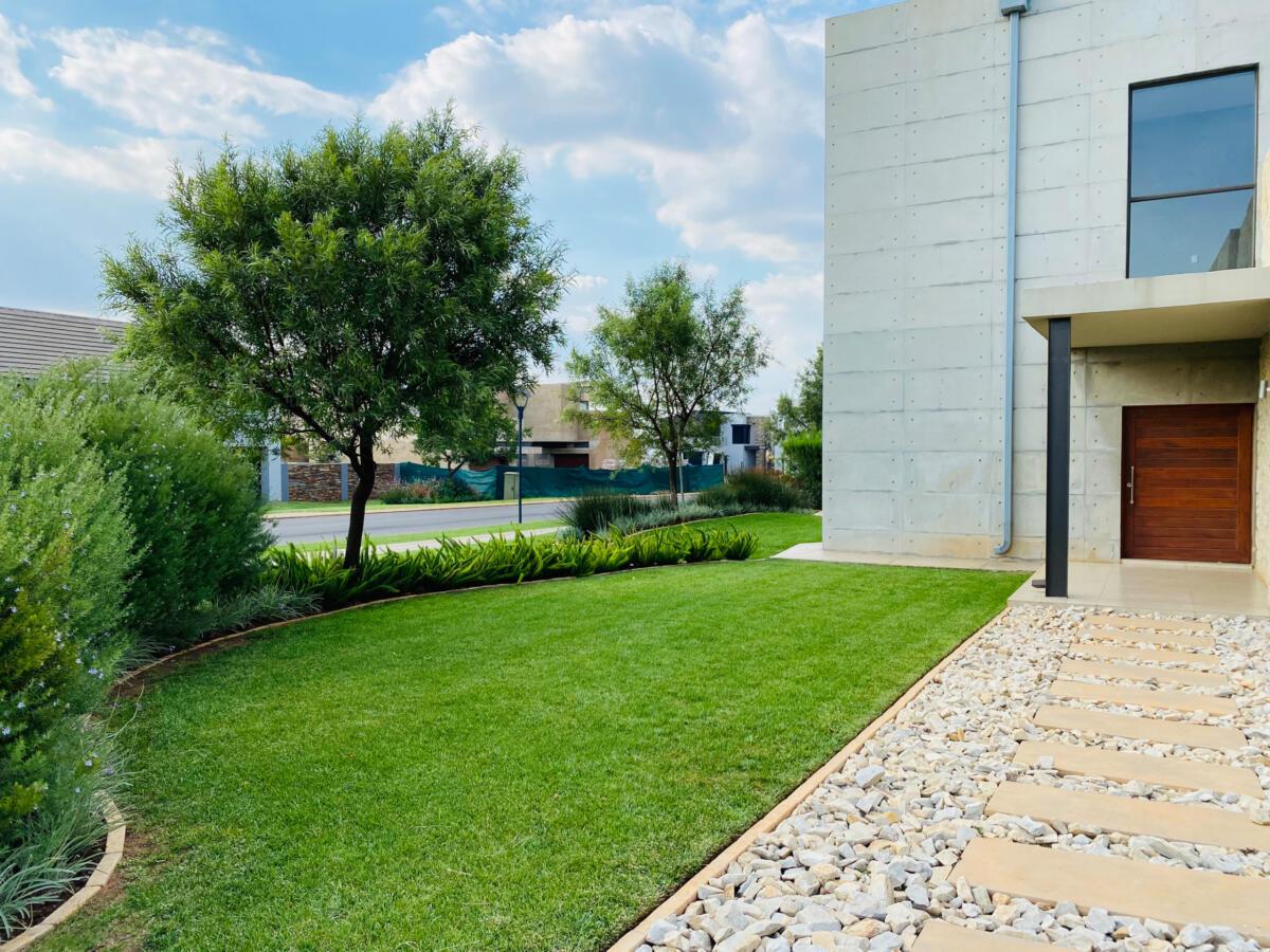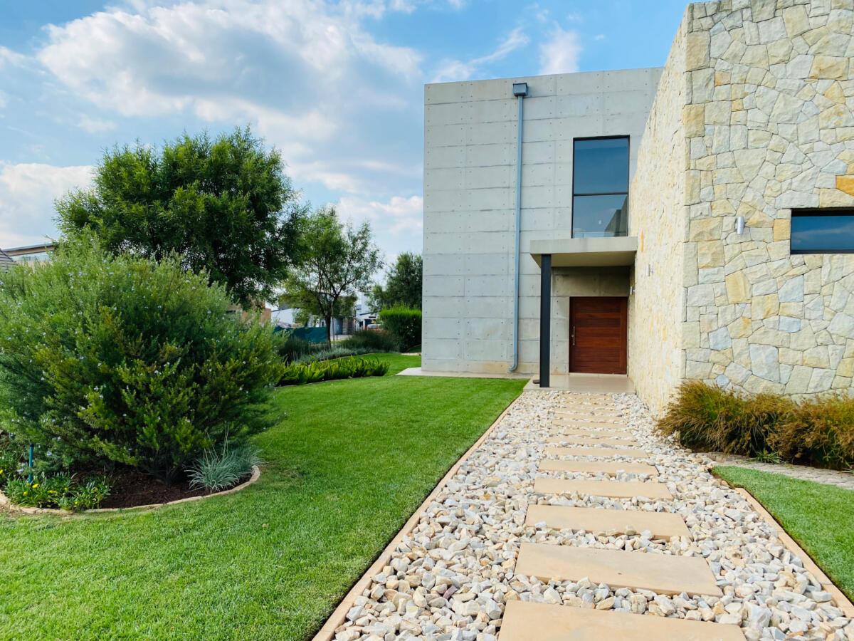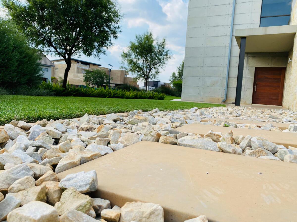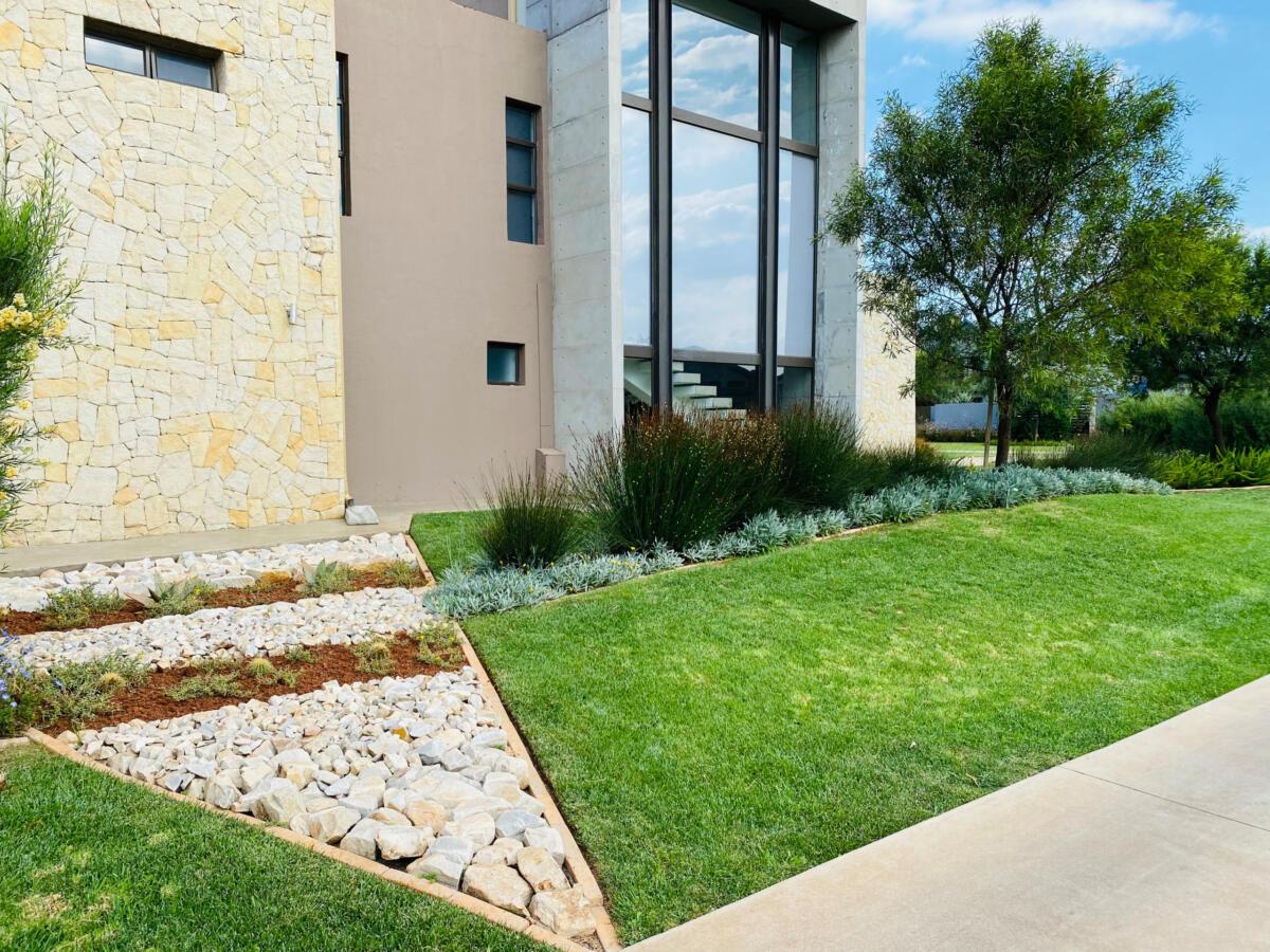 The use of stones was to match the cladding walls which also played a very good role with contrast between the light and dark green plants including the dark green All seasons evergreen grass.