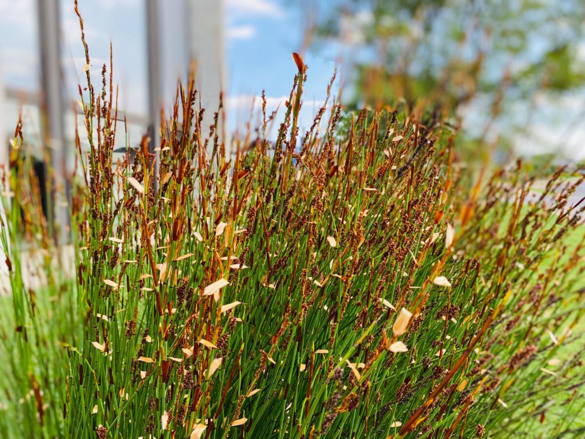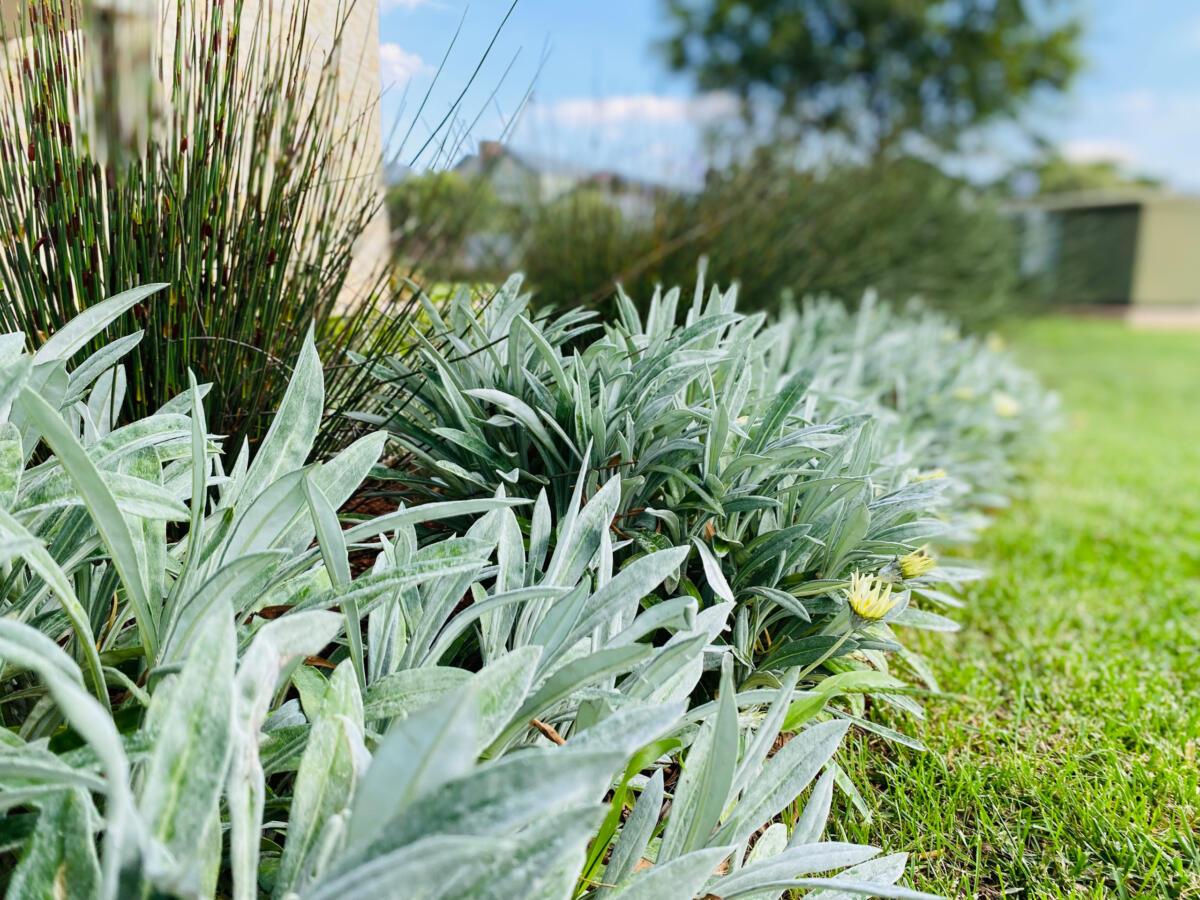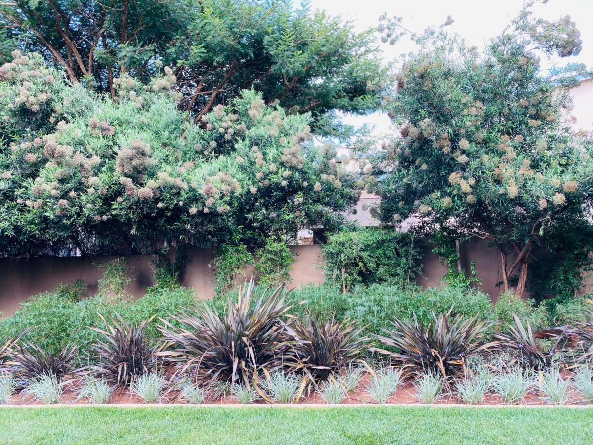 We used soil from the site to create mounds for planting areas along golf cart way. This then allowed us to use plants that will create privacy to the entertainment area. We also wanted to raise the planting beds so as to soften the walls as there are few windows facing the street side.